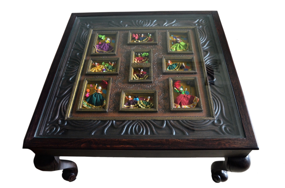 The Heritage Collection-2 Posted on May 28, 2015 /Under Table The solid rosewood color teak table,with all framed up beautiful hand crafted dolls,and multi colored props. Size – Length -36 Inches ,Width – 36 Inches , Height- 19 Inches MRP – 52,000/-